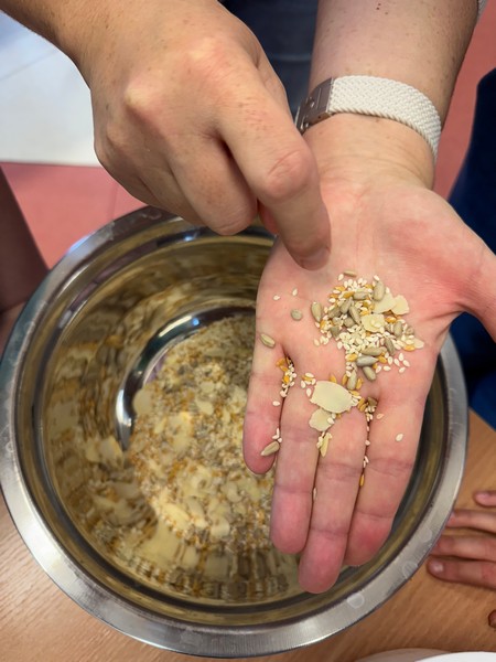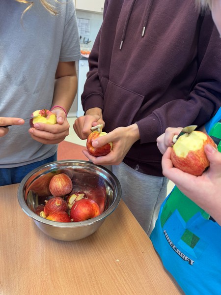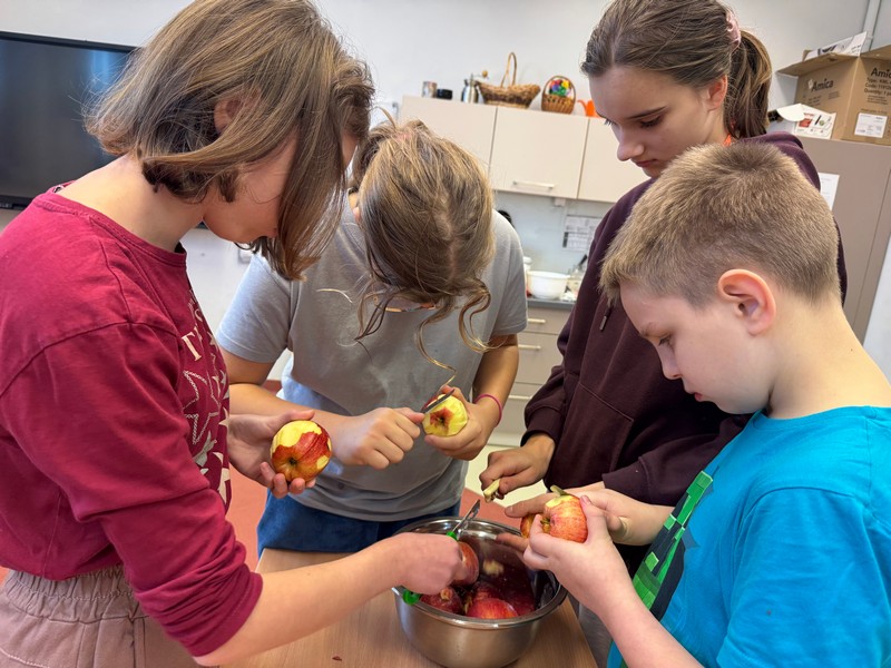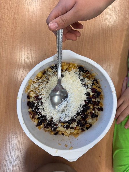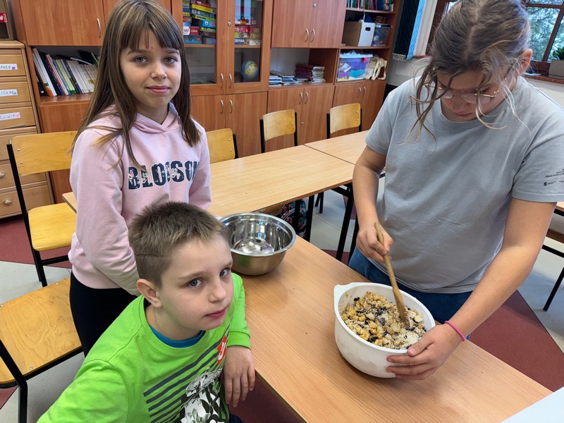 W ramach drugiego spotkania projektowego uczniowie wzięli udział w warsztatach kulinarnych pod hasłemZdrowa przekąska,podczas których przygotowywali ciasto z ekologicznych produktów. Wykorzystano naturalne składniki bogate w wartości odżywcze – różnego rodzaju ziarna, nasiona, orzechy oraz owoce. Uczniowie z zaangażowaniem uczestniczyli w każdym etapie przygotowań, poznając zasady zdrowego odżywiania oraz znaczenie ekologicznych produktów w codziennej diecie. Powstało smaczne i zdrowe ciasto, które wszystkim bardzo smakowało.