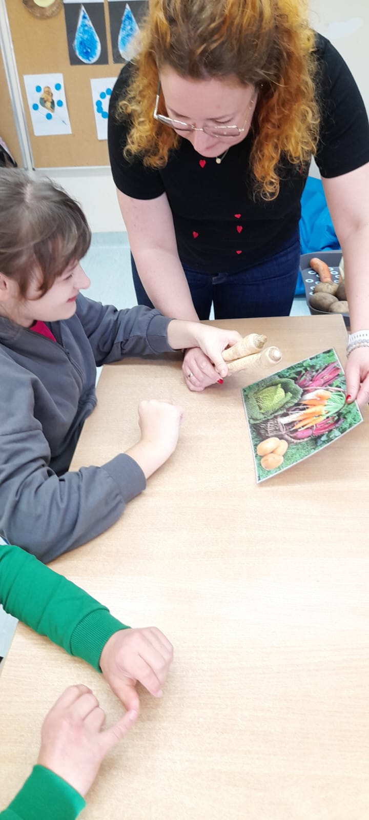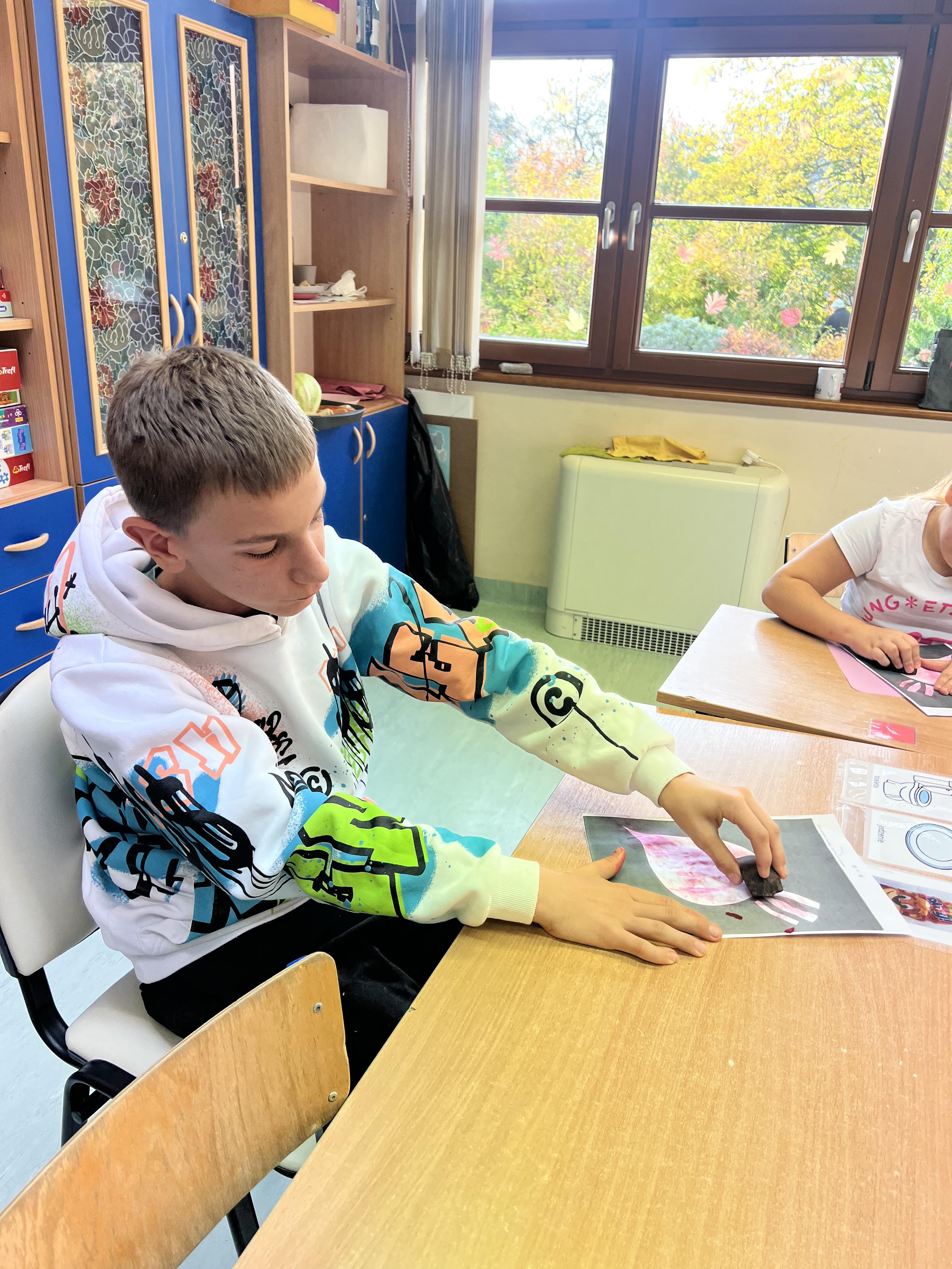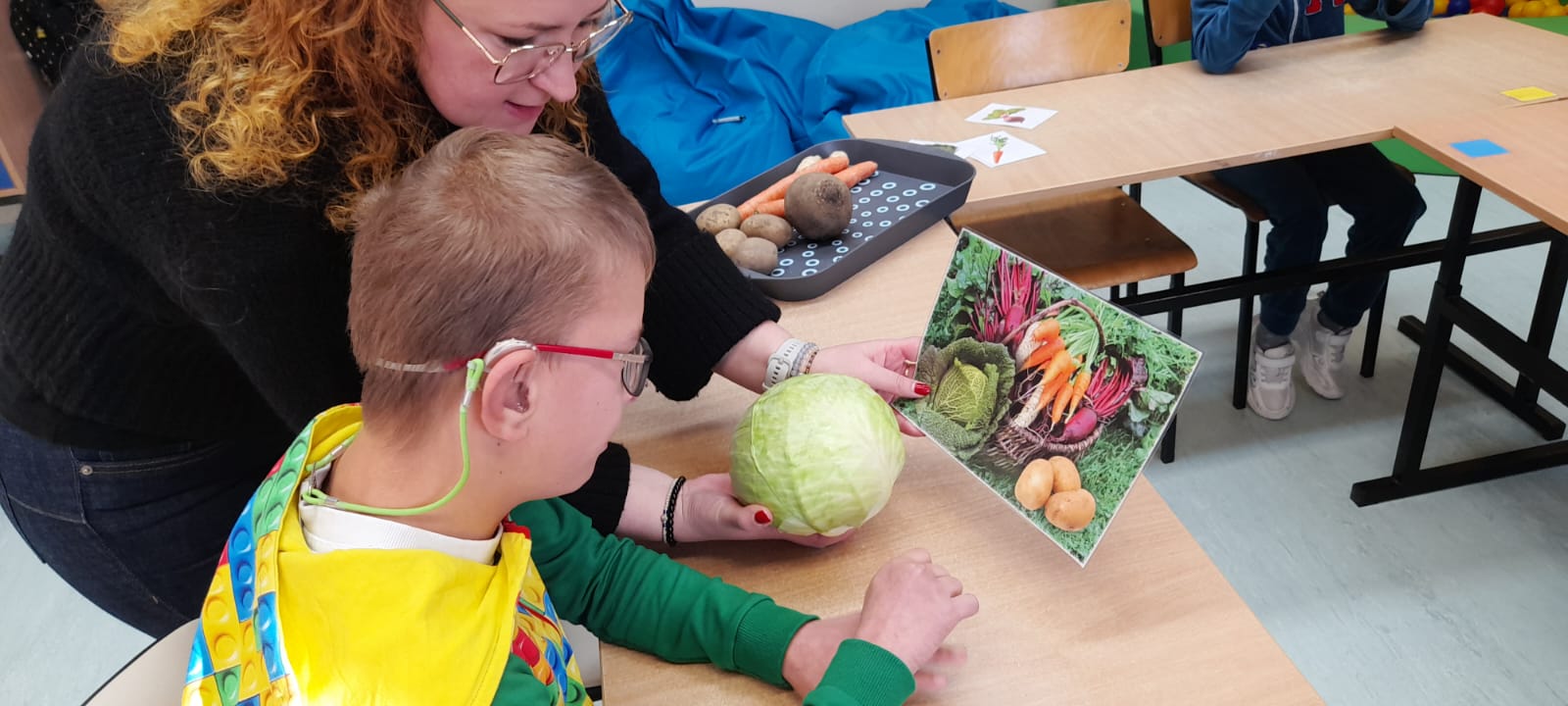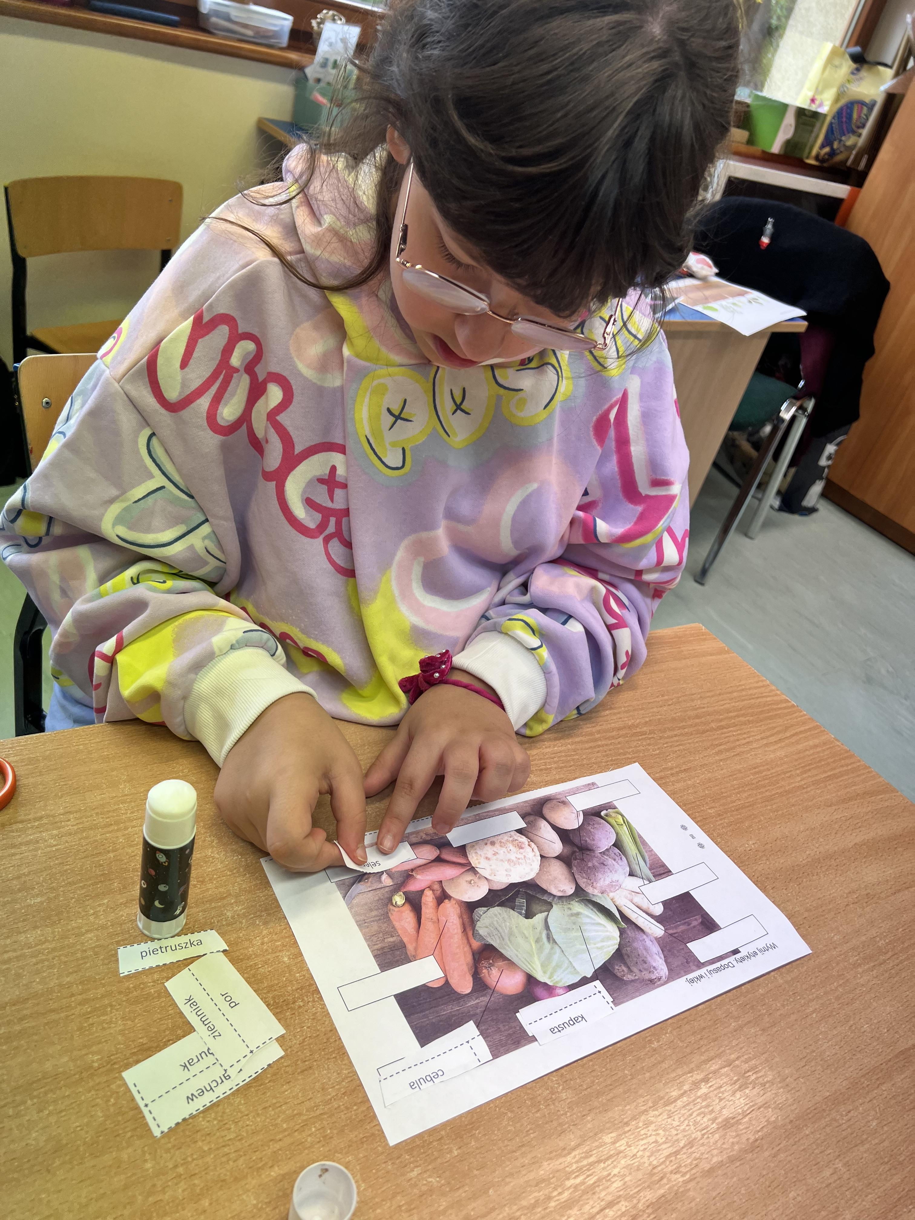 W dniu 22.10.2025 r. uczniowie klas 3b i 3d uczestniczyli w warsztatach tematycznych „Jesienne warzywa”, podczas których w sposób polisensoryczny poznawali warzywa: marchewkę, kapustę, buraka, ziemniaka i pietruszkę. Wykonali pracę plastyczną „Burak”, malując przy użyciu prawdziwego buraka, uzupełniali karty pracy związane z tematem jesiennych warzyw utrwalając zdobyte wiadomości. Uczniowie z dużym zainteresowaniem i radością uczestniczyli we wszystkich aktywnościach, ucząc się poprzez zabawę i doświadczenie.