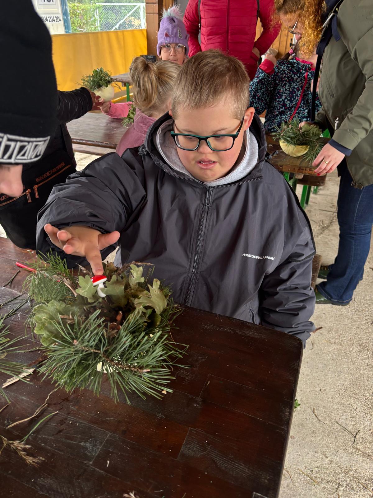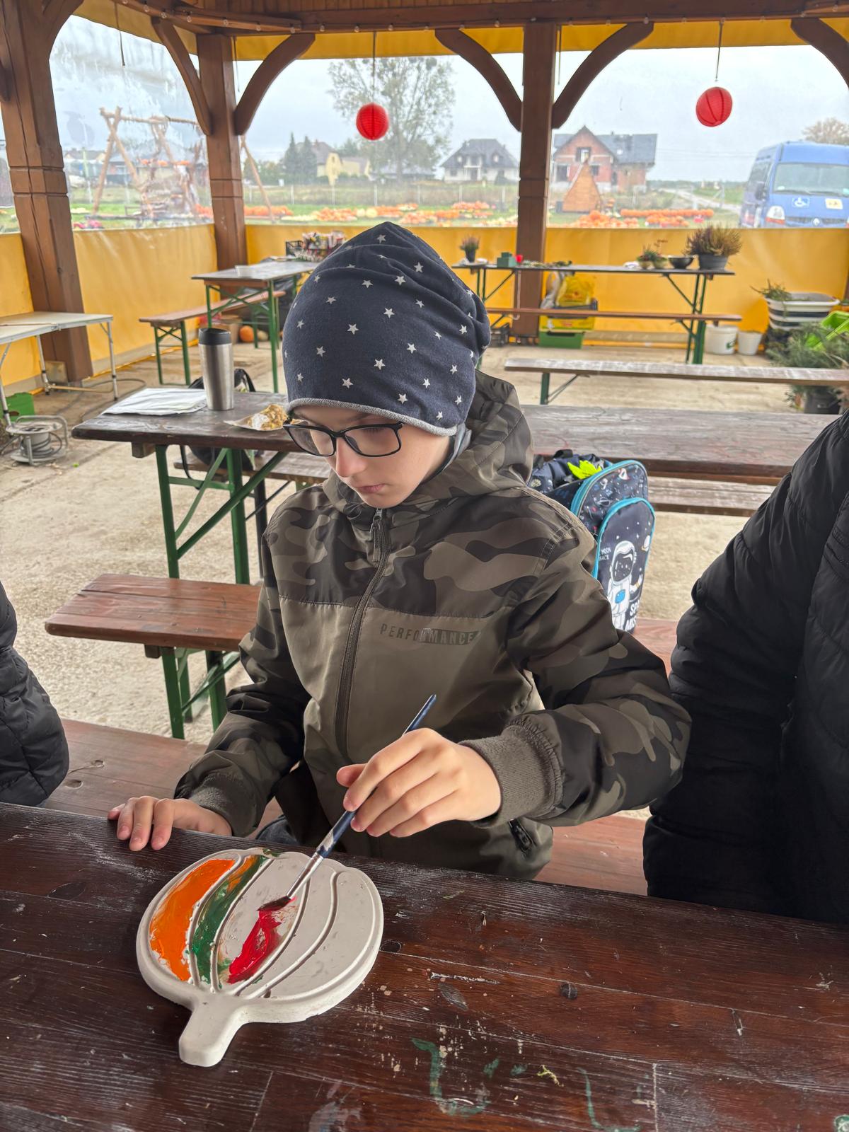 Jedną z głównych atrakcji były warsztaty plastyczne. Uczniowie malowali dynie z gipsu, wykazując się ogromną pomysłowością i wyobraźnią. Następnie tworzyli piękne kompozycje "las w dyni" wykorzystując naturalne materiały, takie jak mech, szyszki, gałązki czy suszone liście. Niesamowicie miłym doświadczeniem było karmienie zwierzątek – kóz, królików i kucyka. Dzięki temu mogliśmy z bliska przyjrzeć się tym zwierzętom. Na zakończenie wycieczki czekała na wszystkich pyszna kiełbaska z grilla.