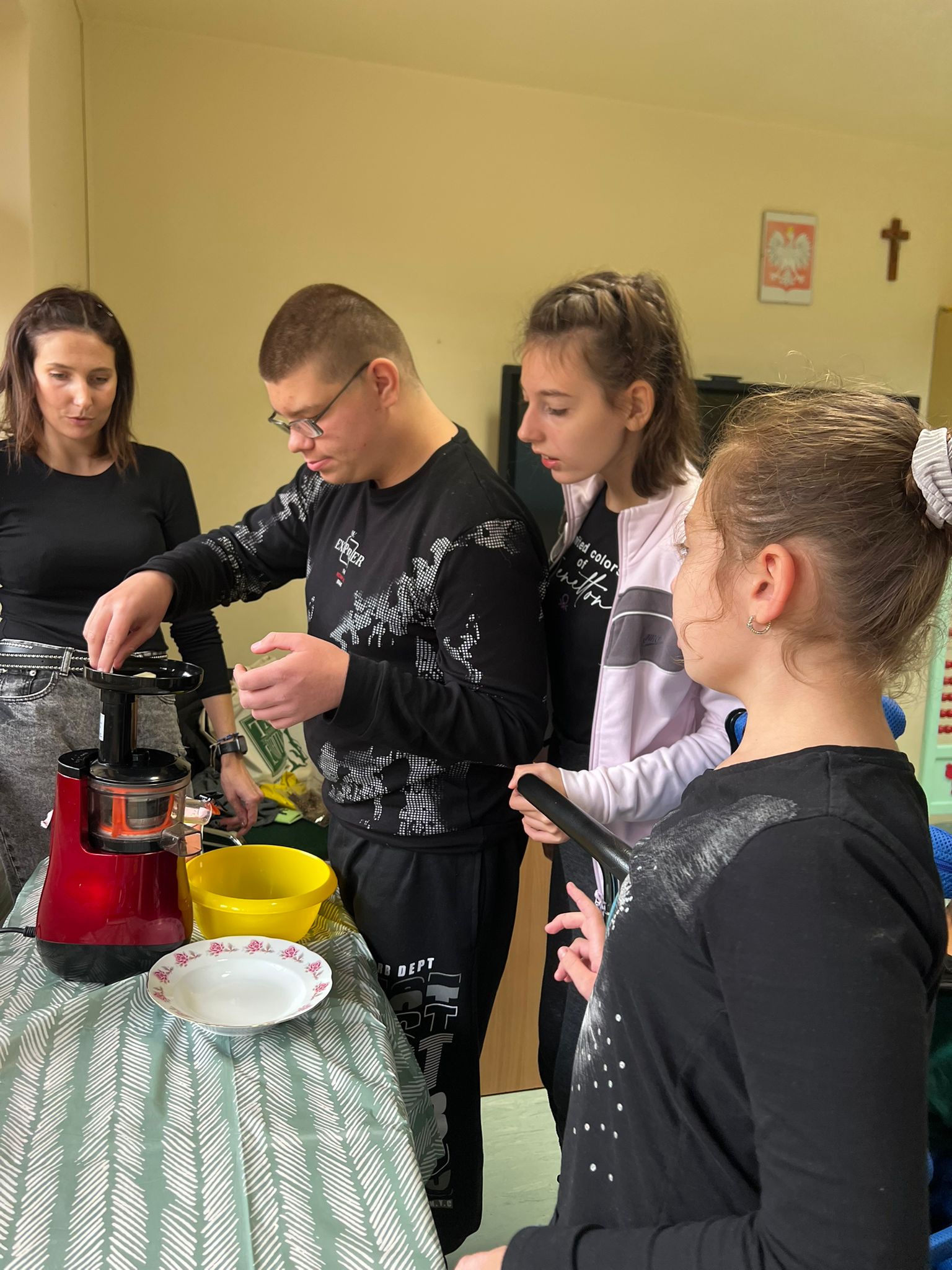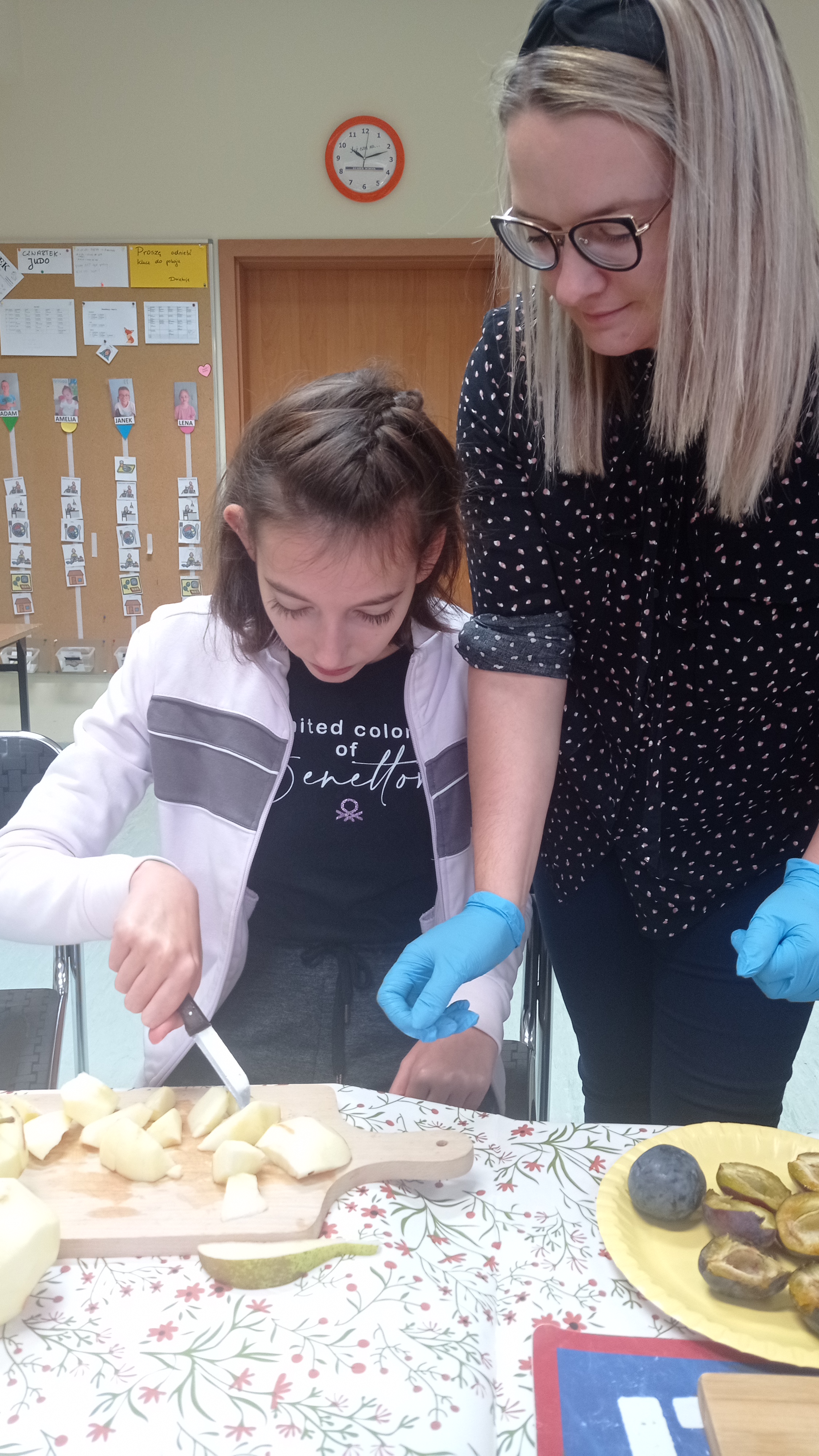 Uczniowie klasy 2a oraz goście z klasy 8c wzięli udział w warsztatach poświęconych jesiennym owocom, ze szczególnym uwzględnieniem jabłek. Dzieci poznały różne gatunki owoców dojrzewających jesienią oraz ich znaczenie dla zdrowia. Największą atrakcją było samodzielne robienie soku gruszkowo-jabłkowego. Uczniowie z zaangażowaniem myli, kroili i wyciskali jabłka oraz gruszki przy użyciu sokowirówki. Każdy miał okazję spróbować świeżo przygotowanego soku – naturalnego, pysznego i bez dodatku cukru. Warsztaty były nie tylko świetną zabawą, ale również cenną lekcją zdrowego odżywiania i pracy zespołowej. Dziękujemy za wspólnie spędzony, owocny dzień!