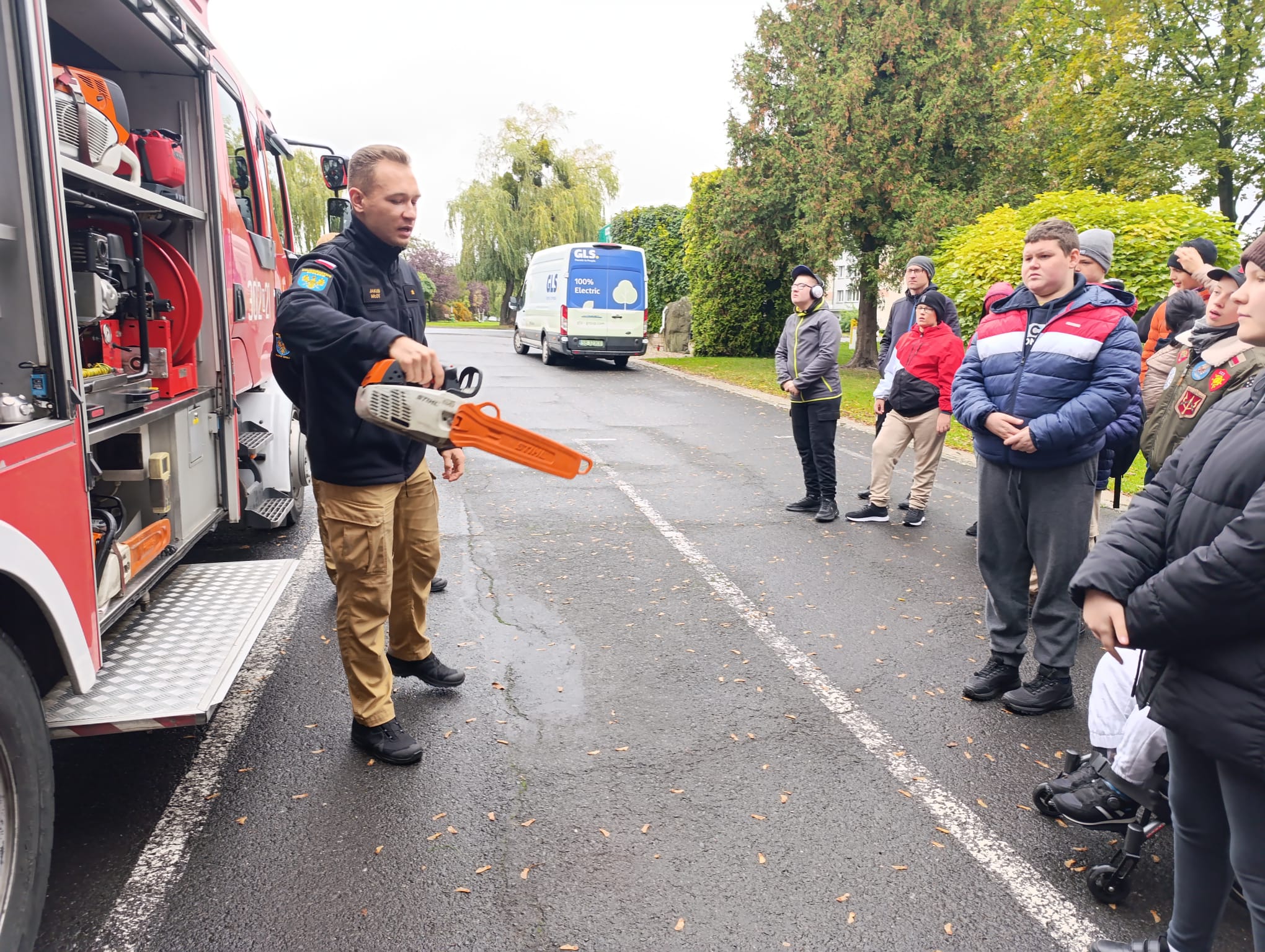 Dbanie o swoje bezpieczeństwo, a także innych, to jedne z celów podstawy programowej. Dziecko powinno wiedzieć jak zachować się w sytuacji zagrożenia, pożaru, do kogo ma się zwrócić o pomoc. Aby zrealizować te cele, dnia 07. 10.2025 roku, liczna grupa z e szkoły przy ulicy Książąt Opolskich wybrała się na lekcję dydaktyczną do Państwowej Straży Pożarnej. Celem wyjścia było również poznanie pracy strażaków, kształtowanie świadomości znaczenia ich zawodu, zapoznanie się uczniów z wyposażeniem wozów strażackich oraz kształtowanie właściwych zasad zachowania w miejscach publicznych.