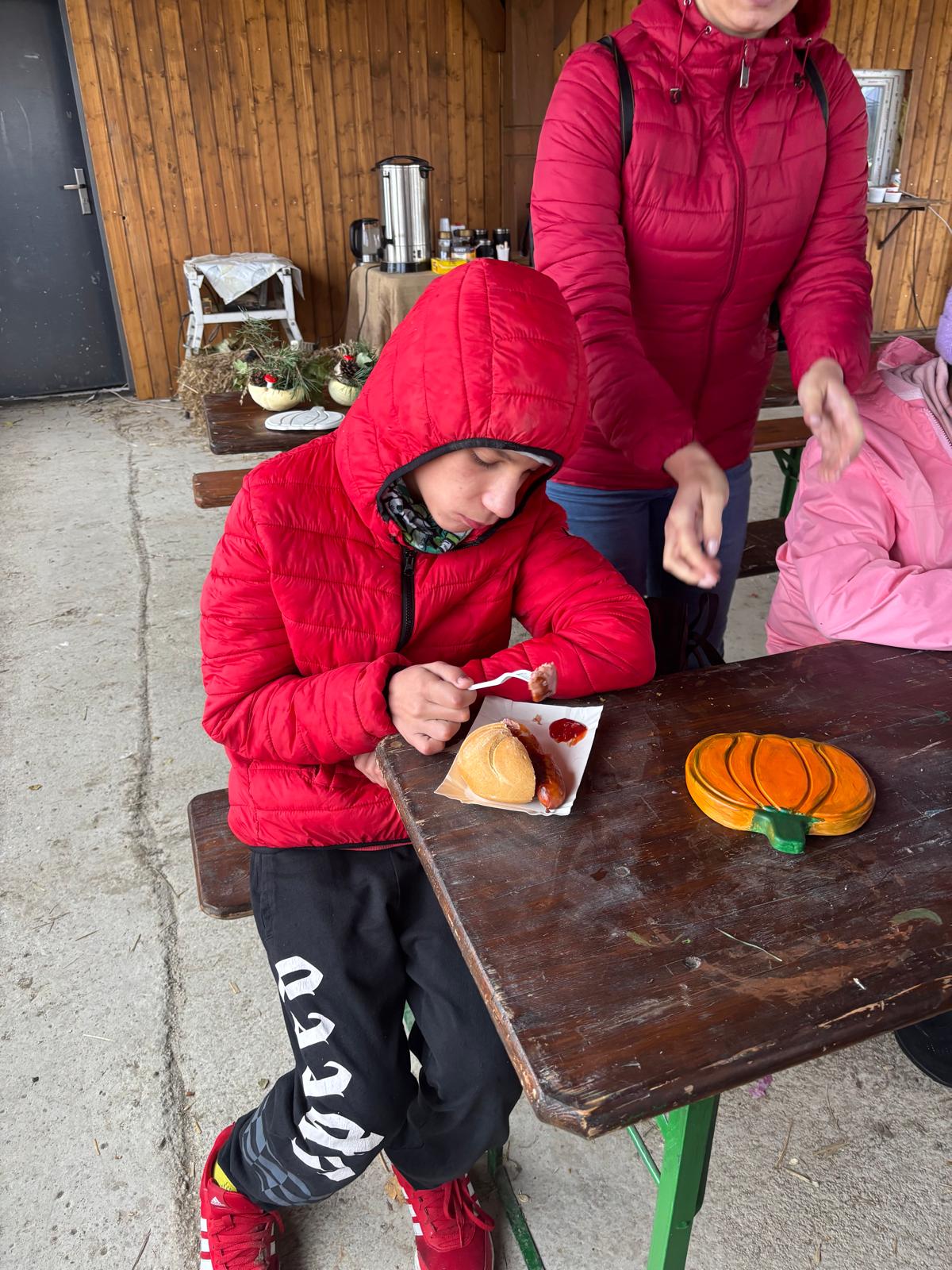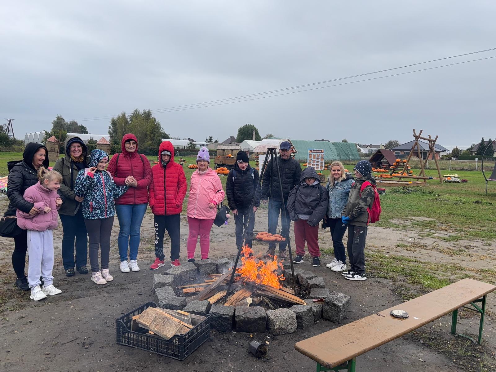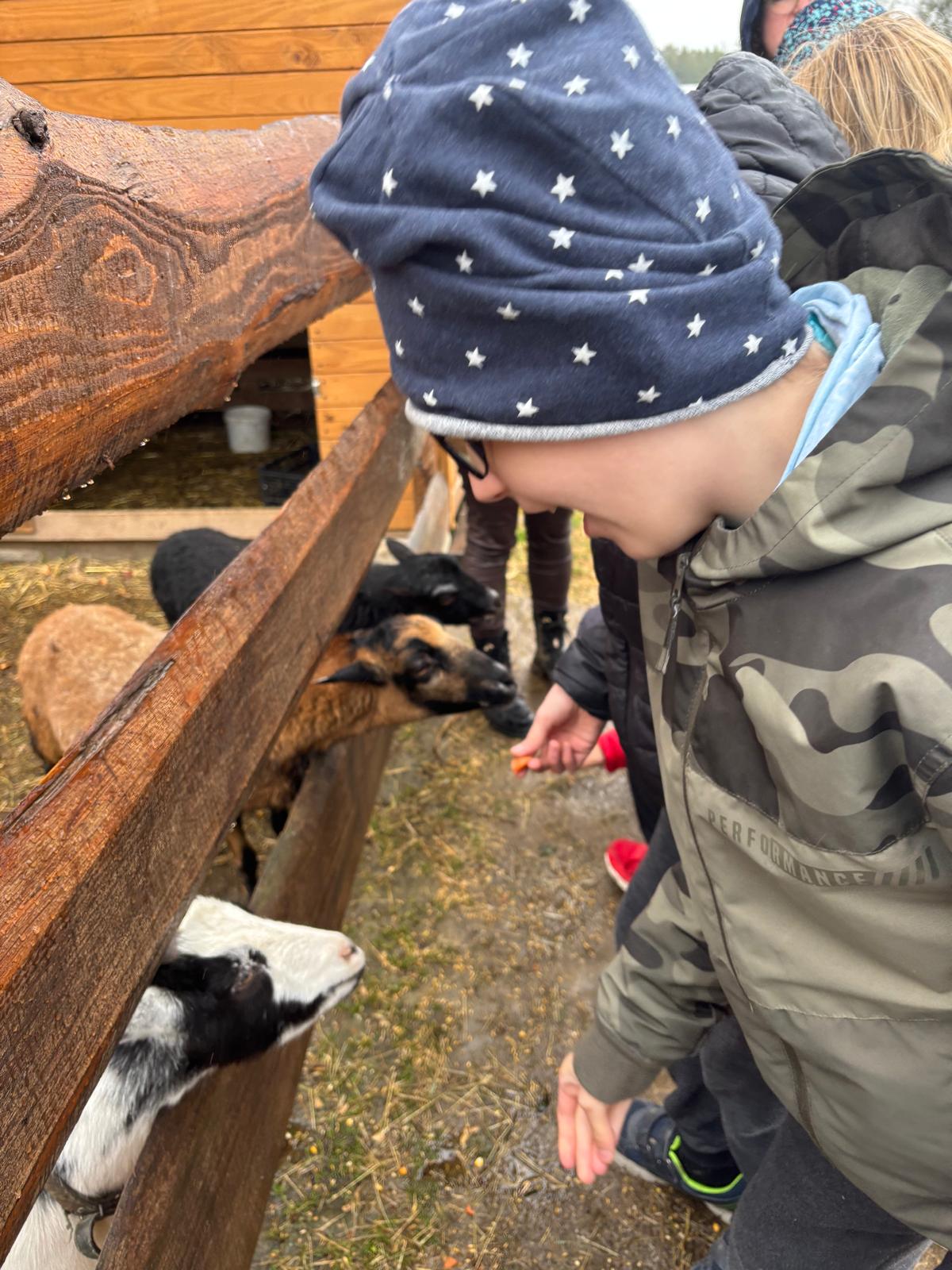 Jedną z głównych atrakcji były warsztaty plastyczne. Uczniowie malowali dynie z gipsu, wykazując się ogromną pomysłowością i wyobraźnią. Następnie tworzyli piękne kompozycje "las w dyni" wykorzystując naturalne materiały, takie jak mech, szyszki, gałązki czy suszone liście. Niesamowicie miłym doświadczeniem było karmienie zwierzątek – kóz, królików i kucyka. Dzięki temu mogliśmy z bliska przyjrzeć się tym zwierzętom. Na zakończenie wycieczki czekała na wszystkich pyszna kiełbaska z grilla.