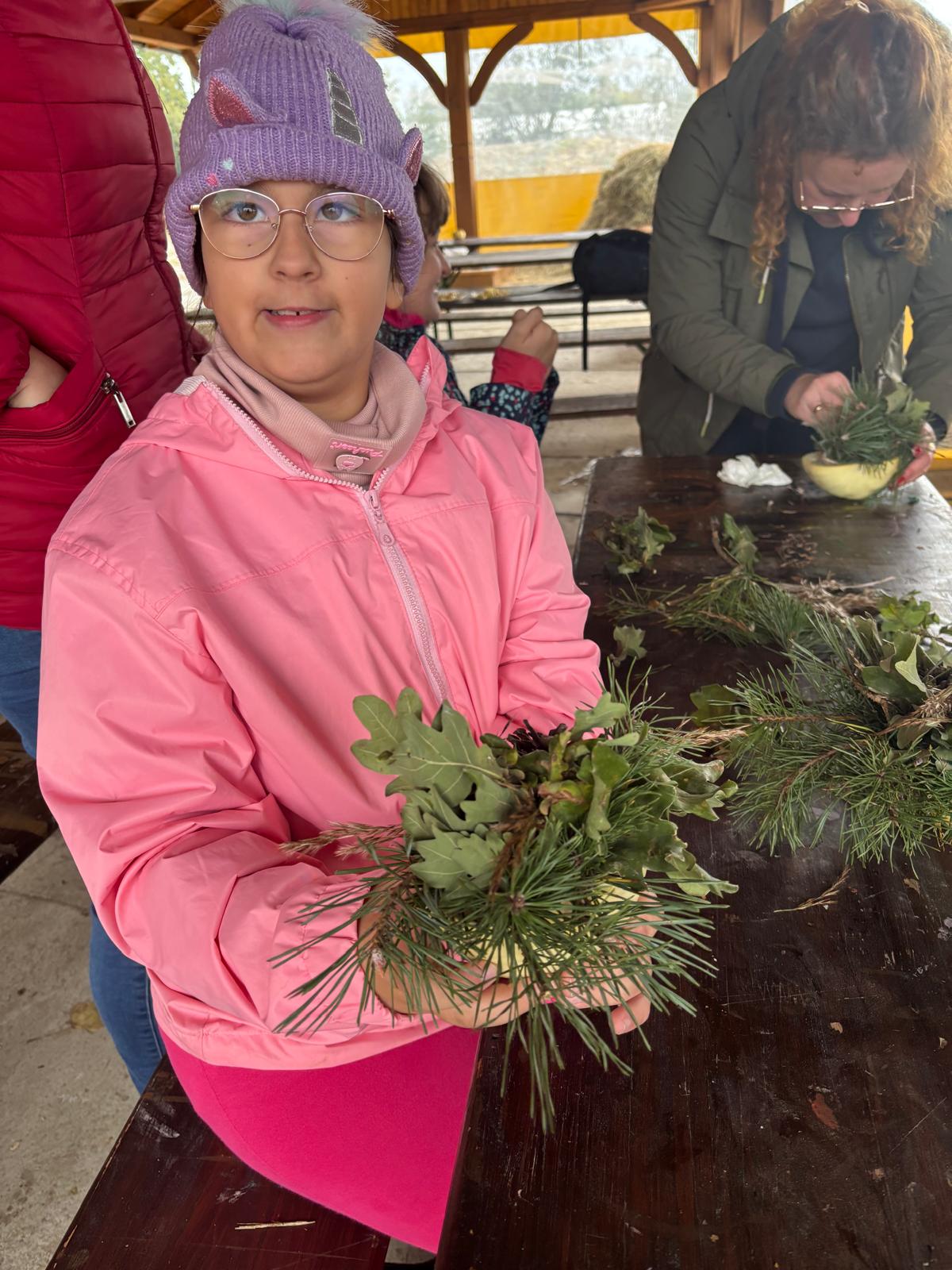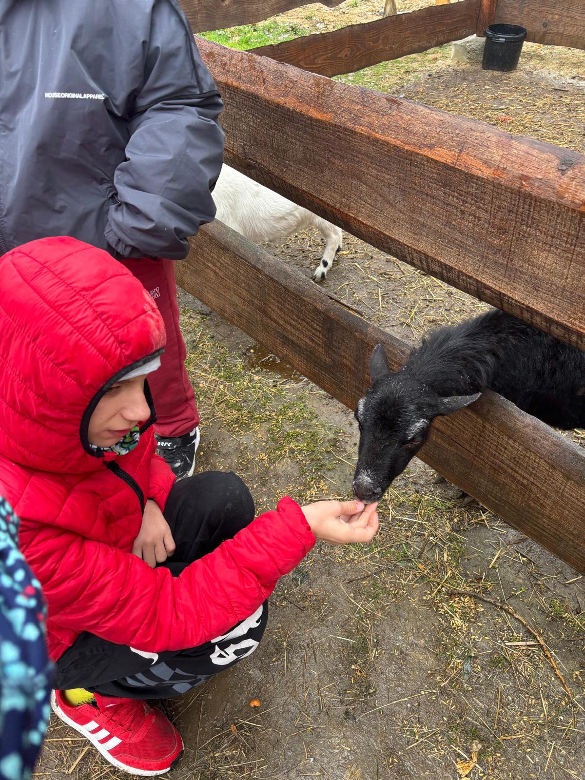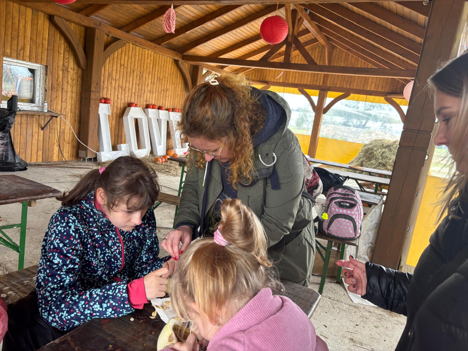 Jedną z głównych atrakcji były warsztaty plastyczne. Uczniowie malowali dynie z gipsu, wykazując się ogromną pomysłowością i wyobraźnią. Następnie tworzyli piękne kompozycje "las w dyni" wykorzystując naturalne materiały, takie jak mech, szyszki, gałązki czy suszone liście. Niesamowicie miłym doświadczeniem było karmienie zwierzątek – kóz, królików i kucyka. Dzięki temu mogliśmy z bliska przyjrzeć się tym zwierzętom. Na zakończenie wycieczki czekała na wszystkich pyszna kiełbaska z grilla.